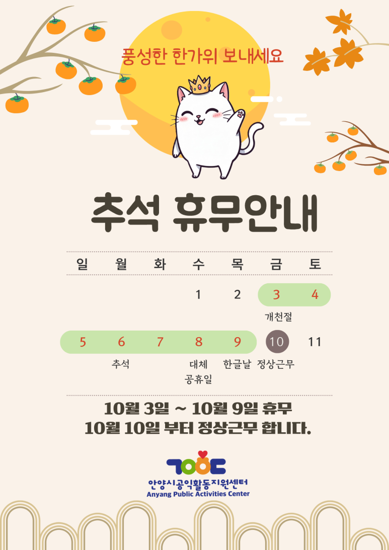 [추석 휴무안내] 10월 3일 ~ 10월 9일