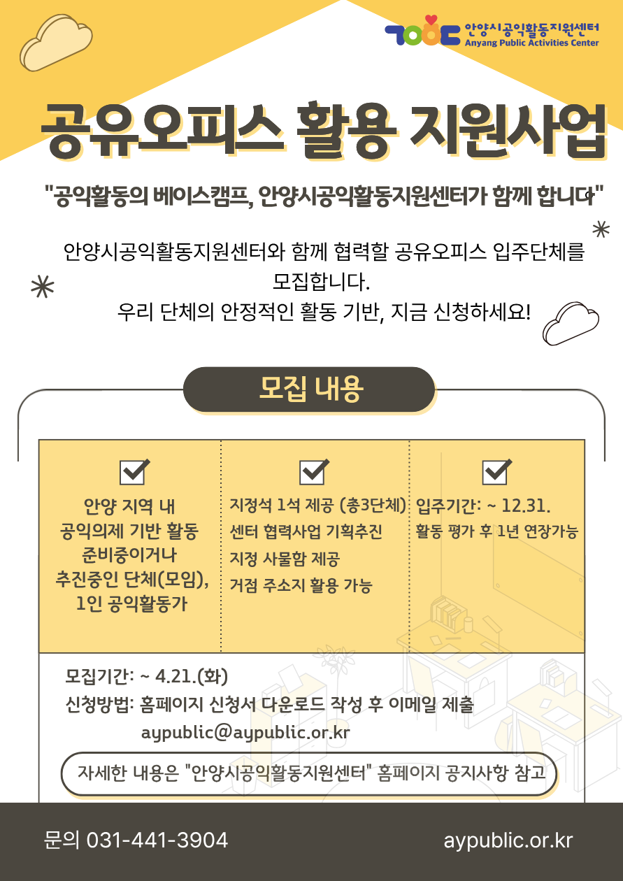안양시공익활동지원센터는 공익단체의 안정적인 거점 공간 지원과 지속가능한 성장·활동을 지원하고자